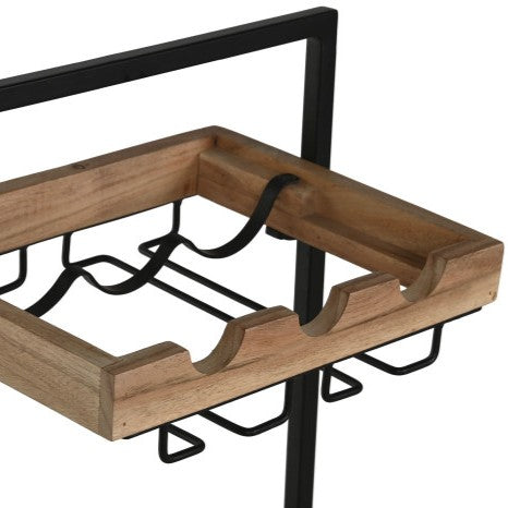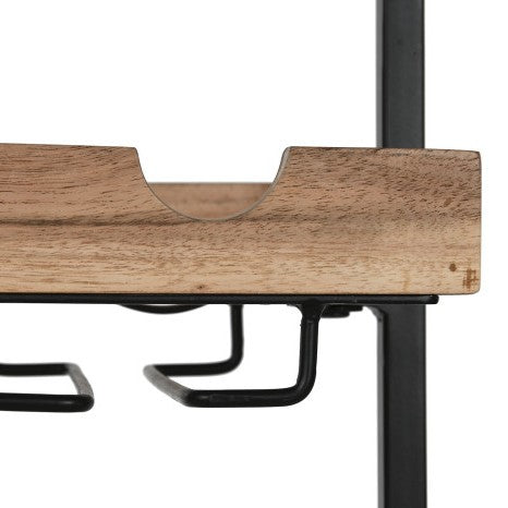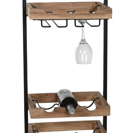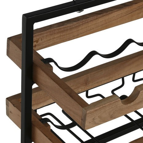 Botellero de madera de acacia maciza con estructura de metal, diseñado para exhibir y almacenar botellas con elegancia industrial. Disponible en dos configuraciones: 65x25x35 cm (8 botellas) o 35x25x75 cm (vertical). Acabado natural que resalta la veta característica de la acacia. Construcción robusta y duradera, perfecta para bodegas, cocinas o espacios de colección.