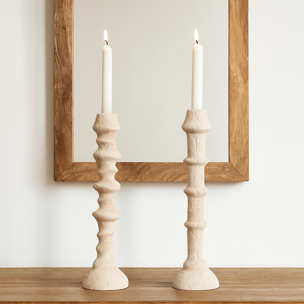 Candelabro de gres en acabado similar piedra. Su diseño elegante y sofisticado imita la textura de la piedra, brindando un toque rústico y contemporáneo a cualquier ambiente. Ideal para agregar calidez y estilo a tu hogar, este candelabro es perfecto para colocar velas y crear una atmósfera acogedora y relajante en salas, comedores o espacios exteriores.