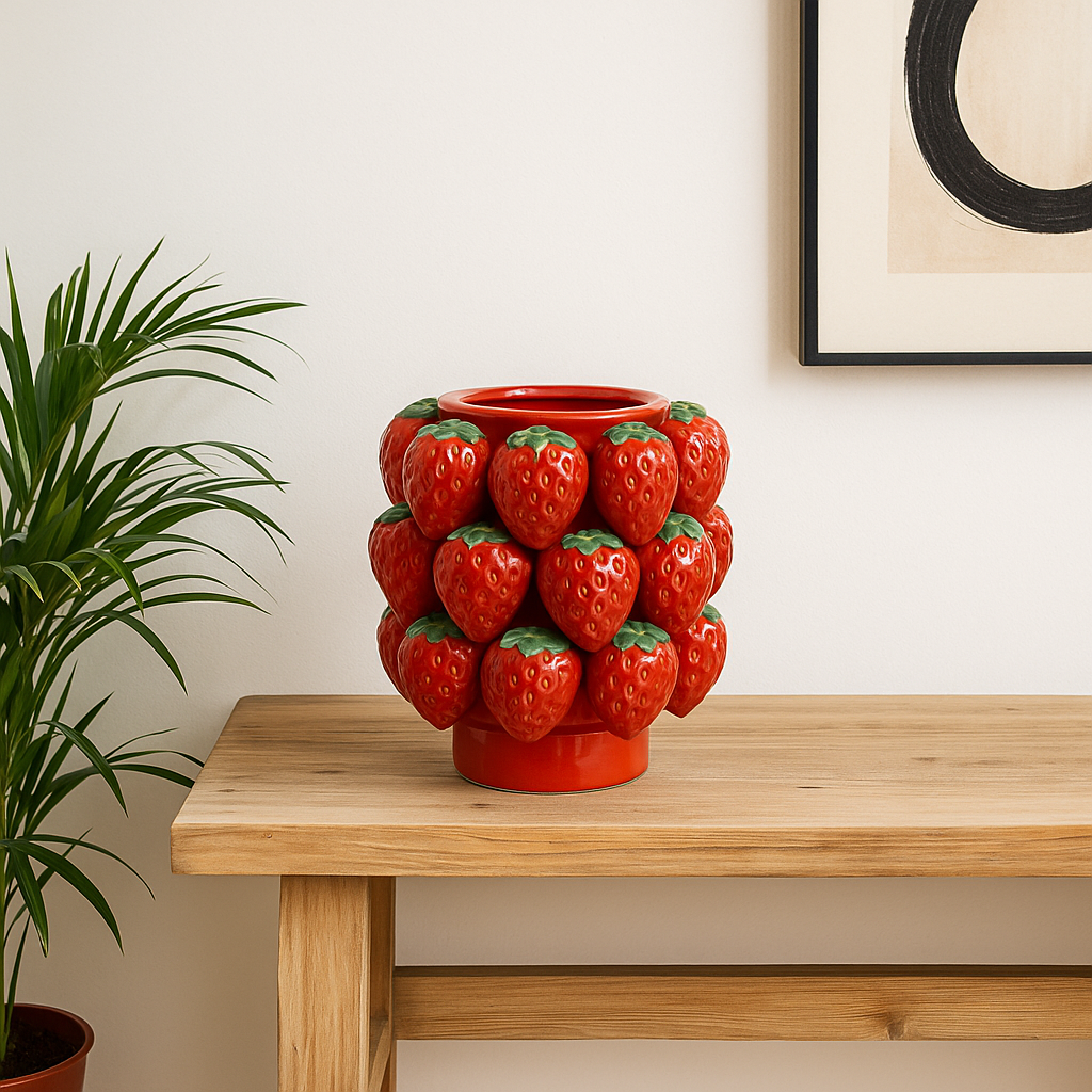 Sorprende a tus invitados con este original jarrón de cerámica gres en acabado rojo brillante, decorado con un relieve de fresas que le aporta un aire fresco y divertido. Su diseño único lo convierte en una pieza decorativa ideal para dar personalidad a tu recibidor, salón o comedor.