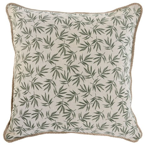 Cojín decorativo de algodón y yute en tonos verdes, con medidas de 45x45 cm y un grosor de 5 cm. Diseño impreso, ideal para añadir un toque natural y elegante a cualquier espacio. Peso de 420 gramos, perfecto para sofás, camas o sillas.