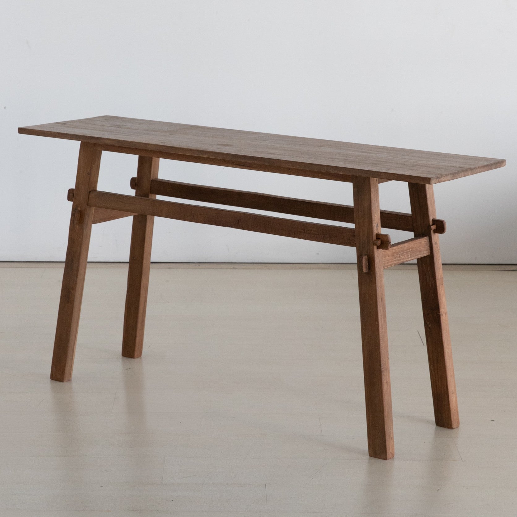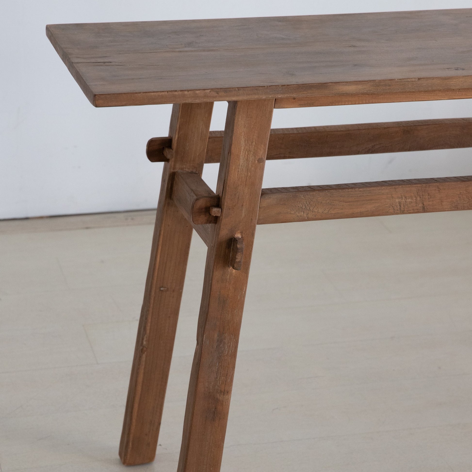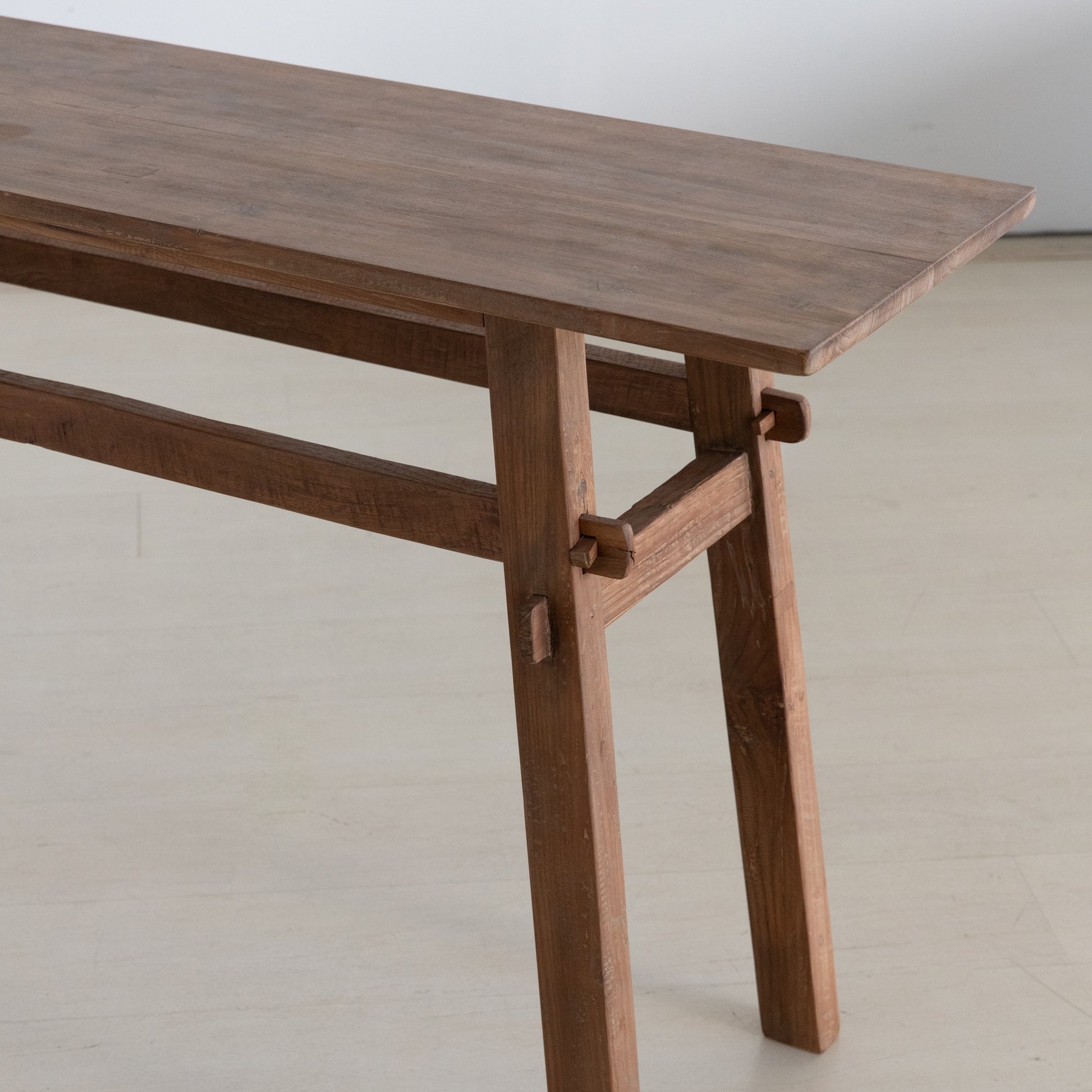 Medidas y características del modelo de la imagen: Consola de 140 cm × 40 cm × 75 cm de madera maciza de teca reciclada con acabado natural.