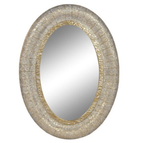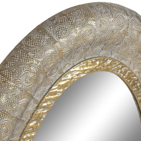 Espejo ovalado de diseño industrial con marco dorado que combina metal y cristal. Sus dimensiones de 78x5,5x106 cm lo convierten en una pieza versátil para pasillos, dormitorios o salones. El acabado dorado aporta calidez y elegancia a cualquier espacio, mientras que su estructura robusta garantiza durabilidad. Perfecto para ampliar visualmente ambientes y añadir un toque vintage a tu decoración.