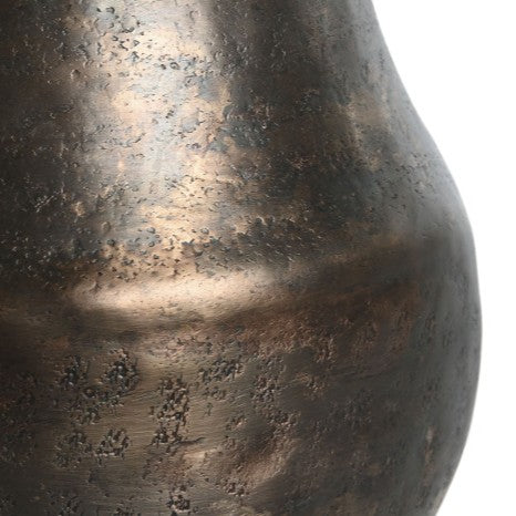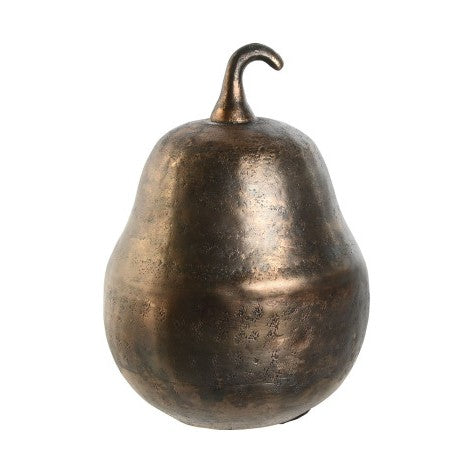 La figura Luent es una escultura decorativa en aluminio con acabado dorado desgastado que evoca la estética industrial vintage. De dimensiones compactas (16x15x22 cm), esta figura con forma de pera añade carácter y profundidad a estanterías, mesas auxiliares o vitrinas. El tratamiento artesanal del metal genera un patina única que realza su presencia visual. Pieza de colección ideal para espacios que valoran el diseño contemporáneo con raíces en la tradición.