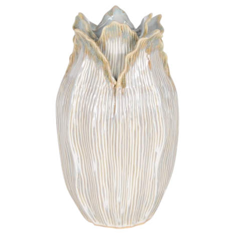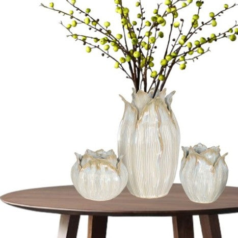Jarrón de cerámica de altura considerable con dimensiones de 19x19x33 cm y otro más bajo de 22X22X19 cm. Su acabado en tonos crema y decoración con motivos de hojas proporciona una estética minimalista y sofisticada. Fabricado en cerámica de calidad, ofrece estabilidad y durabilidad excepcionales. Versátil para espacios modernos o clásicos, este jarrón actúa como pieza central decorativa que realza cualquier ambiente. Ideal para floristas profesionales o coleccionistas de objetos de decoración con carácter artesanal.