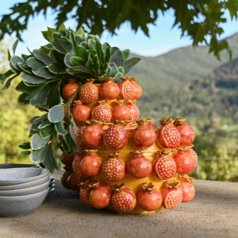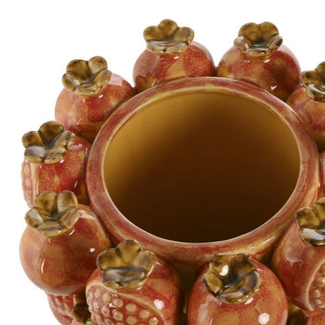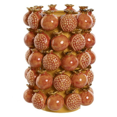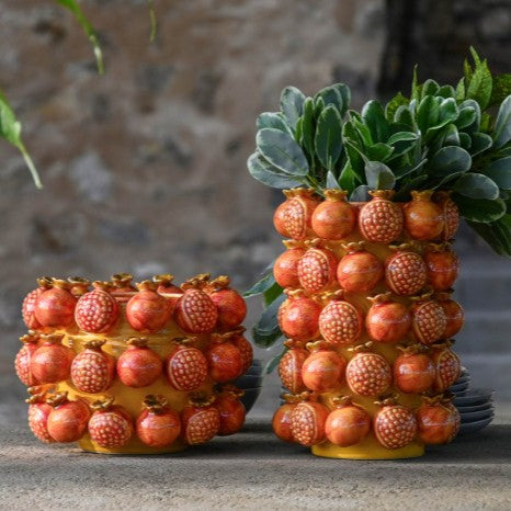 Jarrón de gres artesanal con acabado en tonalidad naranja con diseño de granadas. Pieza de dimensiones generosas (24x24x32 cm y 30X30X20) que combina funcionalidad y estética, ideal para crear puntos focales en espacios con carácter industrial o rústico. Su construcción en gres garantiza durabilidad y resistencia, mientras que su forma cilíndrica permite múltiples usos: desde la exposición de flores secas hasta la decoración minimalista. Un complemento versátil que aporta calidez y autenticidad a cualquier ambiente.
