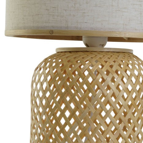 Lámpara de sobremesa Bogor con estructura en bambú natural y pantalla en poliéster blanco. Diseño minimalista que combina materiales nobles con funcionalidad contemporánea. Sus dimensiones compactas (26x26x39 cm) la hacen ideal para escritorios, mesillas de noche o estanterías. La construcción artesanal garantiza durabilidad y un acabado impecable. Perfecta para espacios que buscan calidez sin renunciar a la elegancia. Ilumina con estilo cualquier rincón de tu hogar.