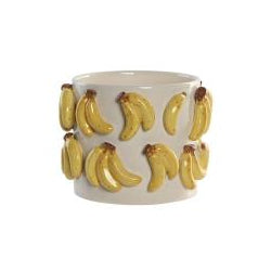 Macetero de cerámica artesanal con acabado en tonos amarillos y motivos de plátanos. Dimensiones de 18x18x14 cm, ideal para plantas de tamaño medio en interiores y exteriores. Su construcción robusta en cerámica garantiza durabilidad y resistencia a cambios climáticos. El diseño decorativo lo convierte en una pieza funcional que complementa cualquier espacio, aportando calidez y carácter vintage a tu colección de plantas. Perfecto para colecciones botánicas o como regalo para amantes de la jardinería.