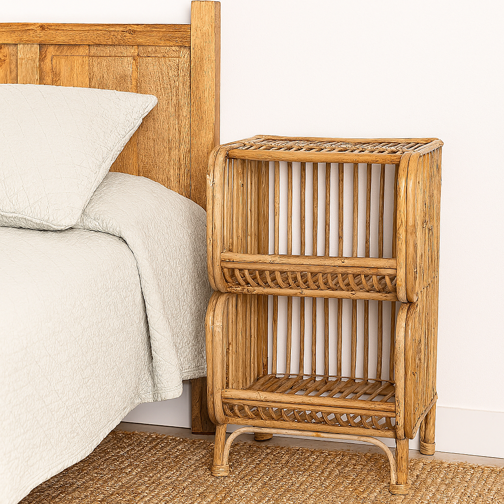 Mesita de noche de mimbre en color natural. Este mueble combina un diseño ligero y moderno con la calidez del material natural, ideal para agregar un toque orgánico y elegante a tu dormitorio. Con su estructura de mimbre, ofrece un estilo fresco y versátil, perfecto para complementar interiores de estilo bohemio o rústico.