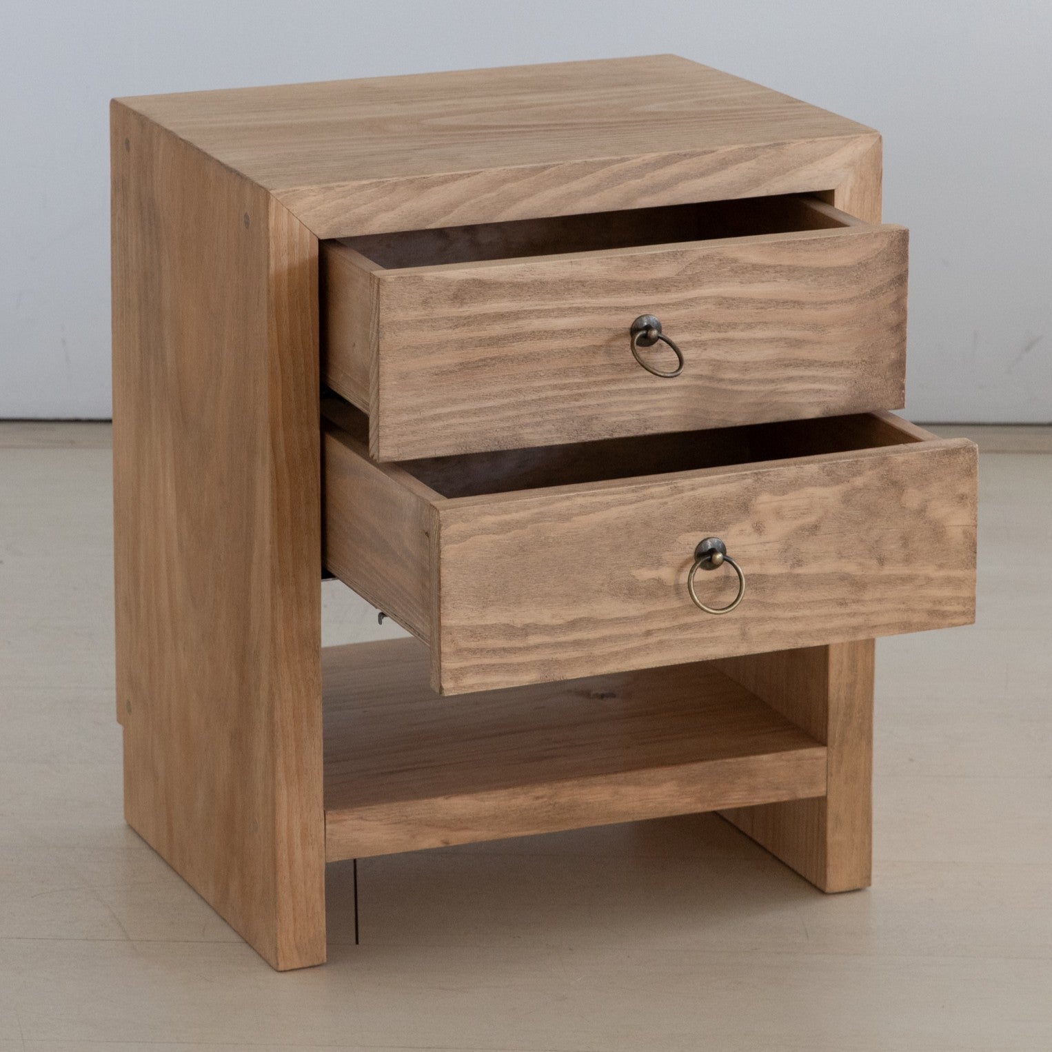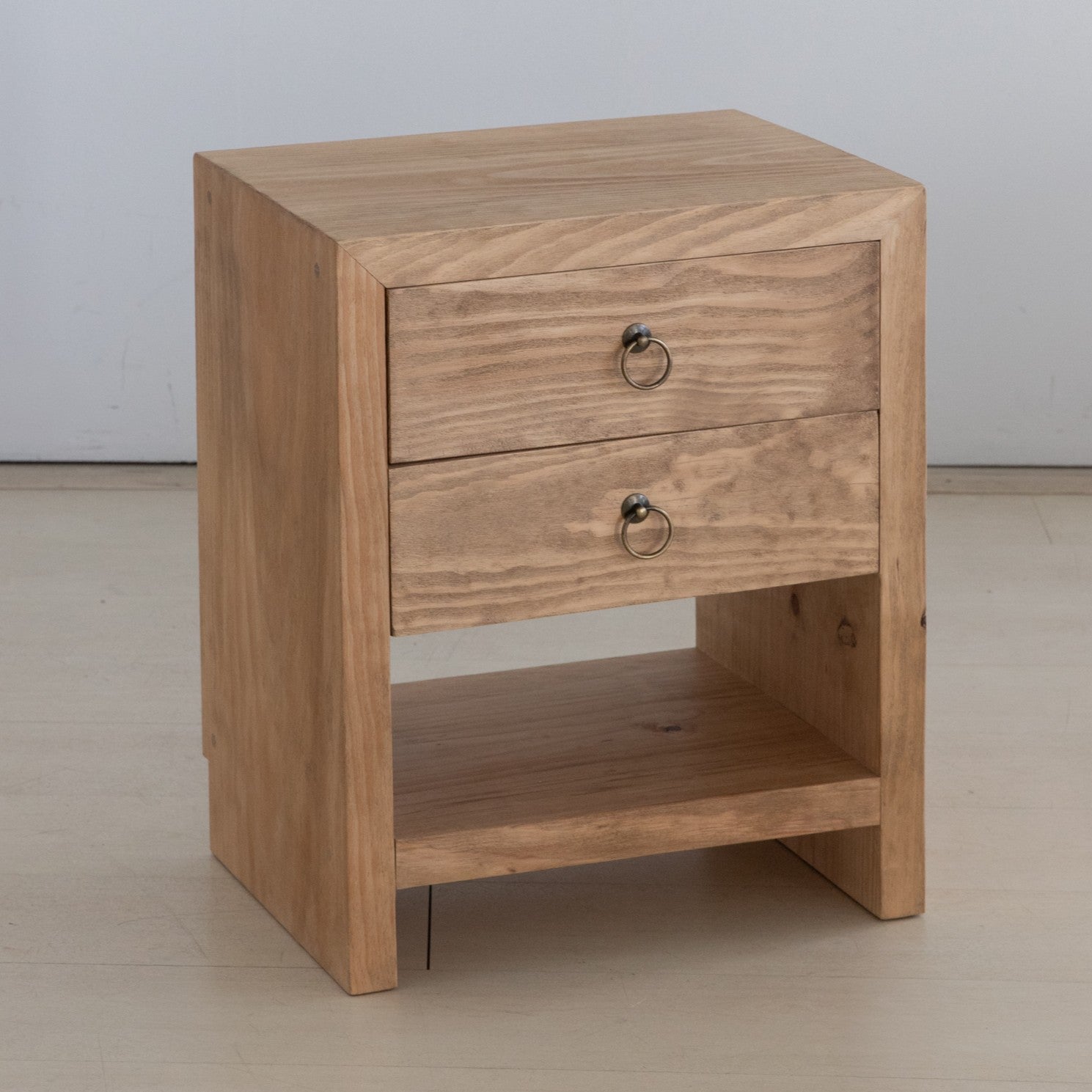 Medidas y características del modelo de la imagen: Mesa de noche de 50 × 35 × 60 cm en madera maciza de pino en acabado arena con dos cajones.