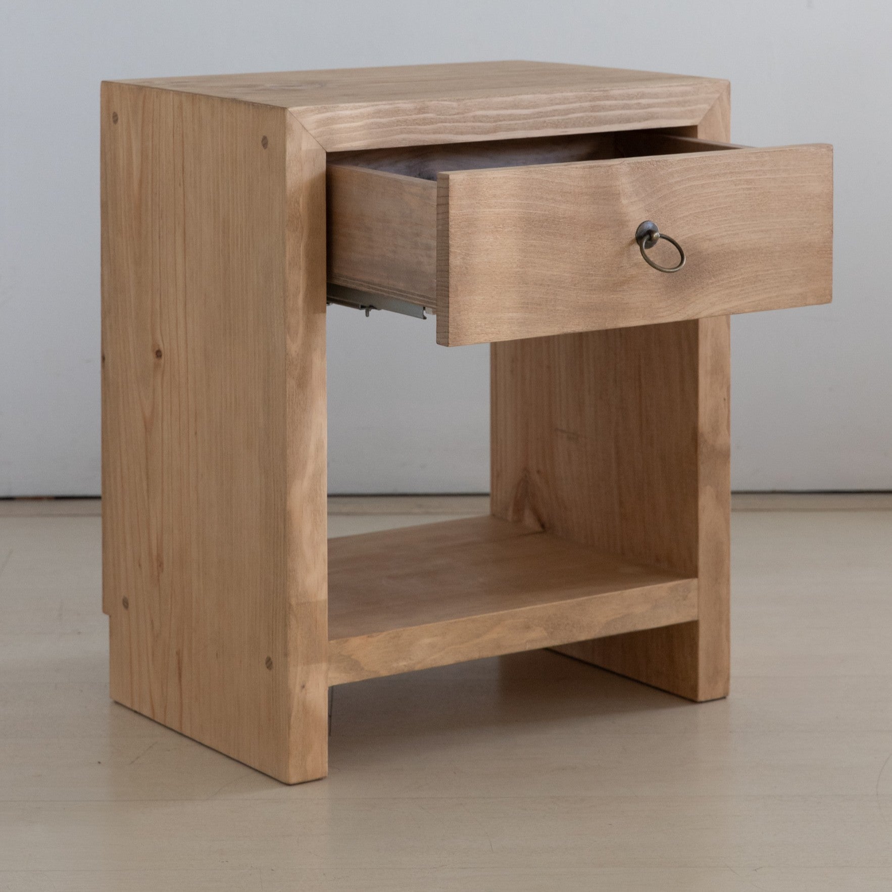 La Mesa de Noche Tiola es una pieza artesanal que combina la calidez de la madera maciza de pino con un diseño rústico y atemporal, pensada para aportar orden, funcionalidad y calidez al dormitorio. Fabricada a mano en Barcelona, este mueble destaca por su solidez, su estética natural y su acabado rústico de corte sierra, que realza la belleza auténtica de la madera.
