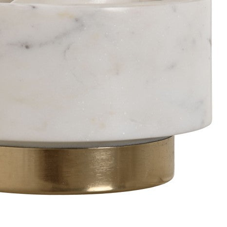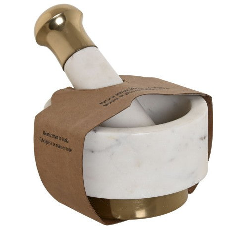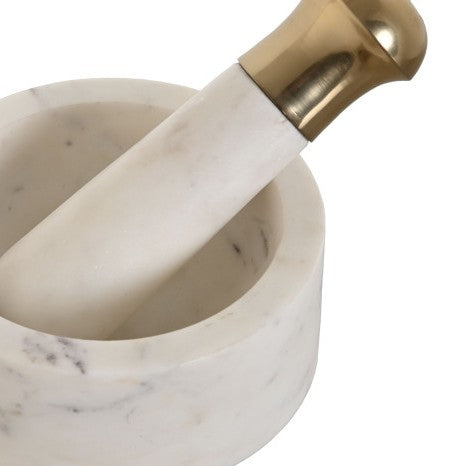 Mortero de mármol blanco natural con mano de latón, dimensiones 12,5x12,5x7,5 cm. La combinación de materiales nobles garantiza una herramienta de cocina duradera y funcional para moler especias, hierbas y condimentos con precisión. El mármol proporciona una superficie estable y no porosa, mientras que el latón ofrece un agarre ergonómico y resistente. Su acabado natural blanco aporta elegancia a la cocina, integrándose con cualquier estilo decorativo. Ideal para chefs y cocineros que valoran la calidad artesanal y la eficiencia en la preparación culinaria.