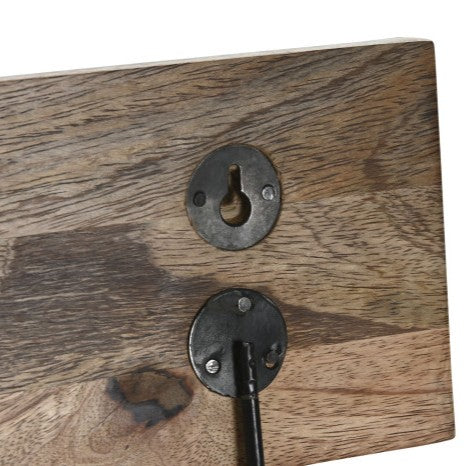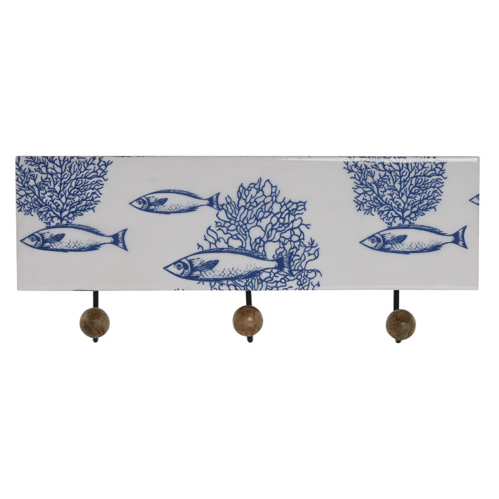 Perchero de madera de mango maciza con acabado lacado en negro. Diseño minimalista de peces azules que combina funcionalidad y estética industrial. Tres perchas de metal forjado ofrecen espacio generoso para abrigos, sombreros y accesorios. Dimensiones compactas (38x5x18 cm) lo hacen ideal para recibidores, pasillos o dormitorios. Construcción robusta y duradera, perfecta para uso diario en hogares que valoran la calidad artesanal y el diseño atemporal.